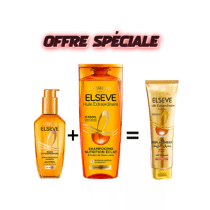 Ce pack L’Oréal Elseve « Huile Extraordinaire » propose une routine complète pour cheveux secs. Il comprend une huile de nuit « Midnight » (100ml) pour une réparation profonde, un shampooing « Nutrition Éclat » (200ml) pour la brillance et la douceur, et un soin « Oil Replacement » (125ml) pour une nutrition intense. L’ensemble vise à hydrater, nourrir et sublimer les cheveux.