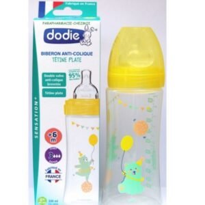 Le biberon à tétine multi-perforée Dodie est un biberon anti-colique qui se distingue par sa tétine, dotée de plusieurs caractéristiques