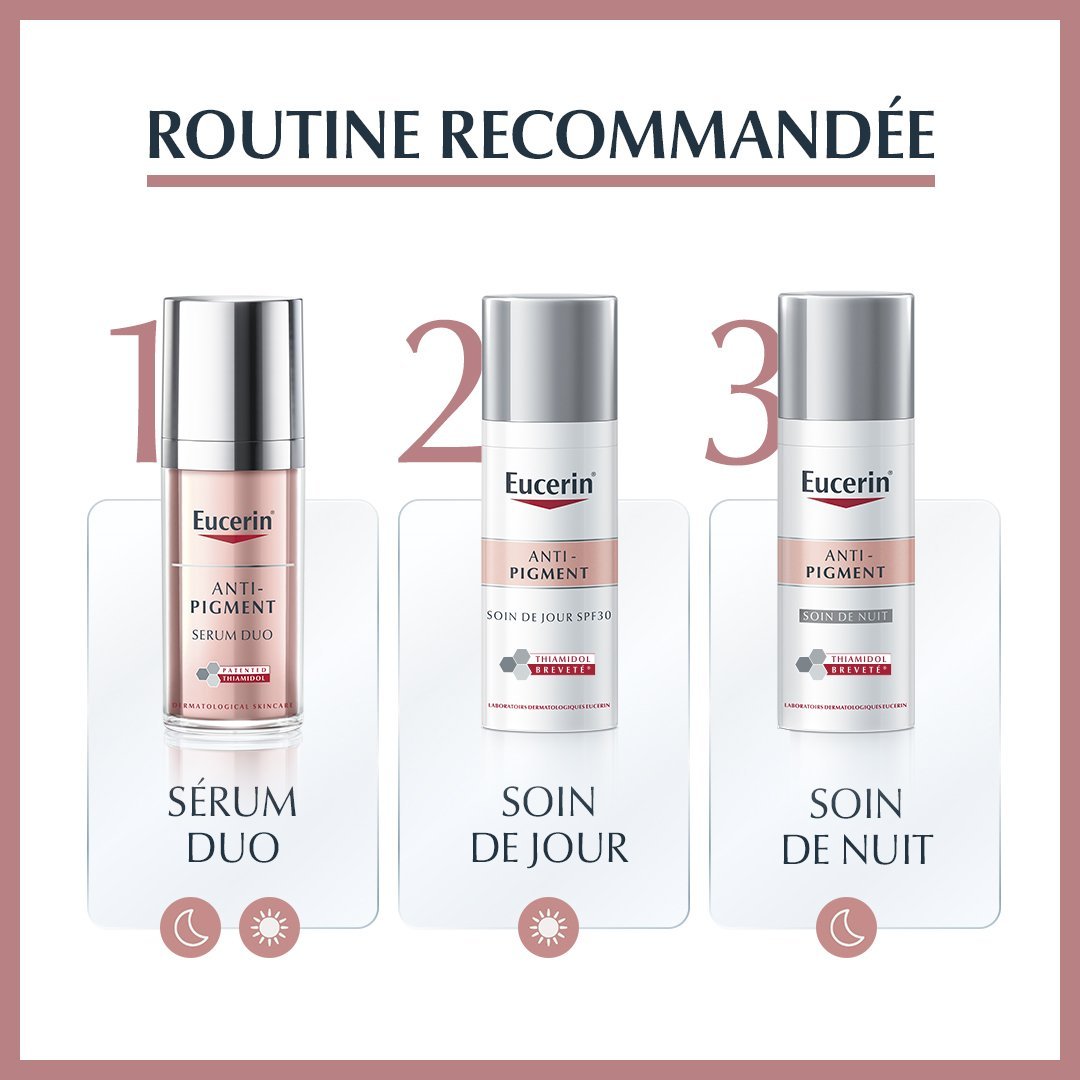 Suite à de nombreux tests en laboratoire, il a été cliniquement prouvé que la gamme innovante Anti-Pigment d’Eucerin réduit les taches brunes telles que les taches de vieillesse causées par l’exposition au soleil et les empêche de réapparaître. L’ingrédient très efficace Thiamidol réduit la production de mélanine dans la peau, agissant à l’origine de l’hyperpigmentation. Fabriquée à partir de cet ingrédient breveté par Eucerin, la gamme comprend plusieurs produits pour traiter l’hyperpigmentation.