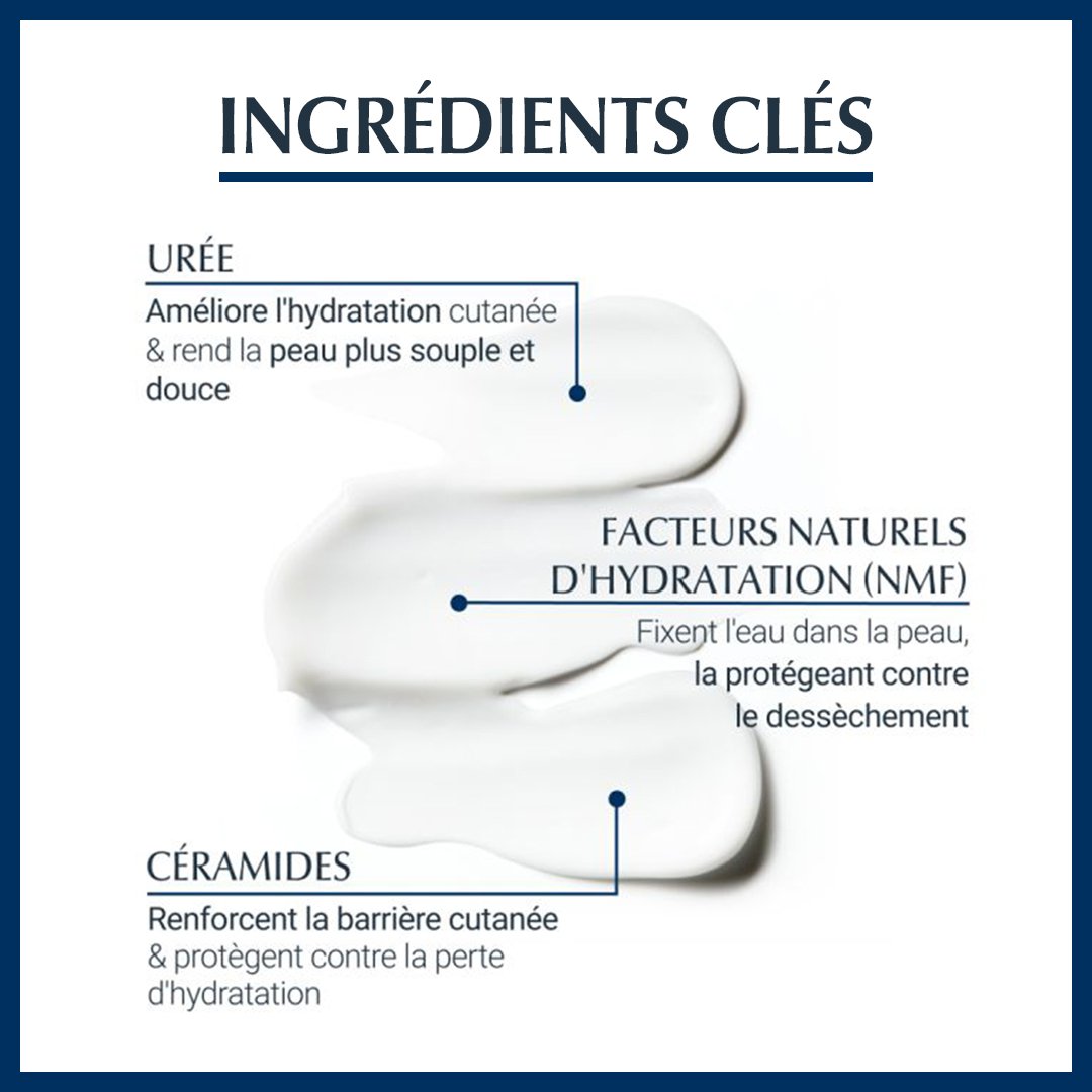 Formule INCI : Aqua, Glycerin, Urea, Cetearyl Alcohol, Glyceryl Glucoside, Ethylhexyl Cocoate, Sodium Lactate, Butyrospermum Parkii Butter, Caprylic/Capric Triglyceride, Octyldodecanol, Dicaprylyl Ether, Tapioca Starch, Glyceryl Stearate SE, Hydrogenated Coco-Glycerides, Alanine, Arginine HCL, Carnitine, Ceramide NP, Cholesterol, Chondrus Crispus Extract, Glycine, Helianthus Annuus Seed Oil, Lactic Acid, Sodium Cetearyl Sulfate, Sodium Chloride, Sodium PCA, Tocopherol, Dimethicone, Methyl Benzoate, Pentylene Glycol, Decylene Glycol, Phenoxyethanol, Parfum