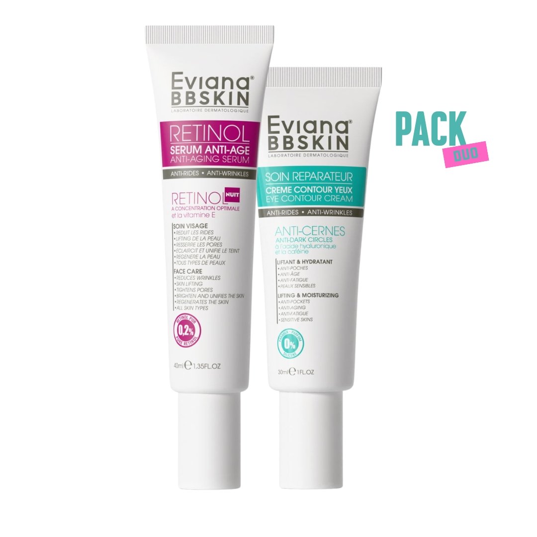 Le Pack Anti-Âge RETINOL + Contour des Yeux d’EVIANA est une solution complète pour lutter contre les signes du vieillissement et révéler une peau plus jeune et radieuse.