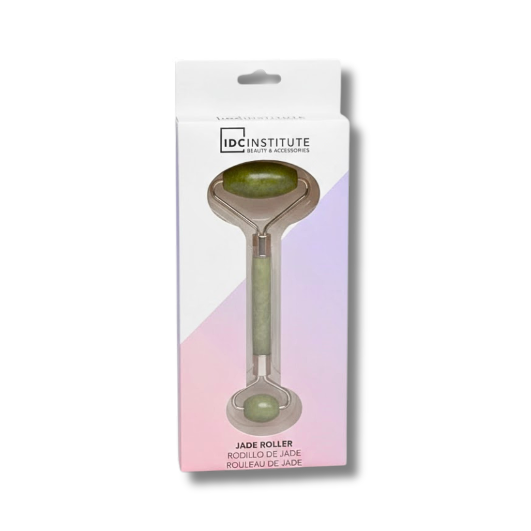 Rouleau facial en jade IDC Institute, idéal pour masser le visage, stimuler la circulation et améliorer l’éclat de la peau.