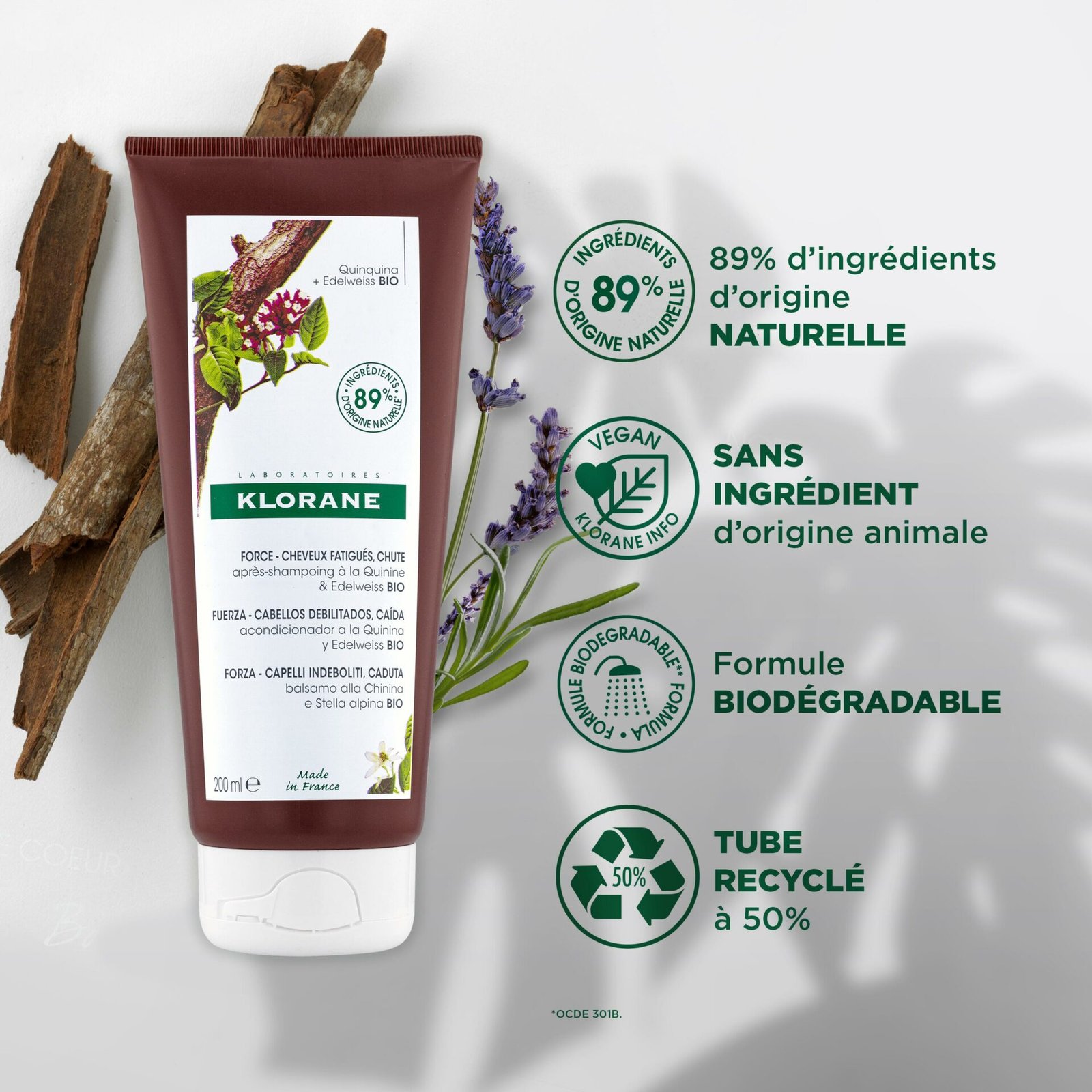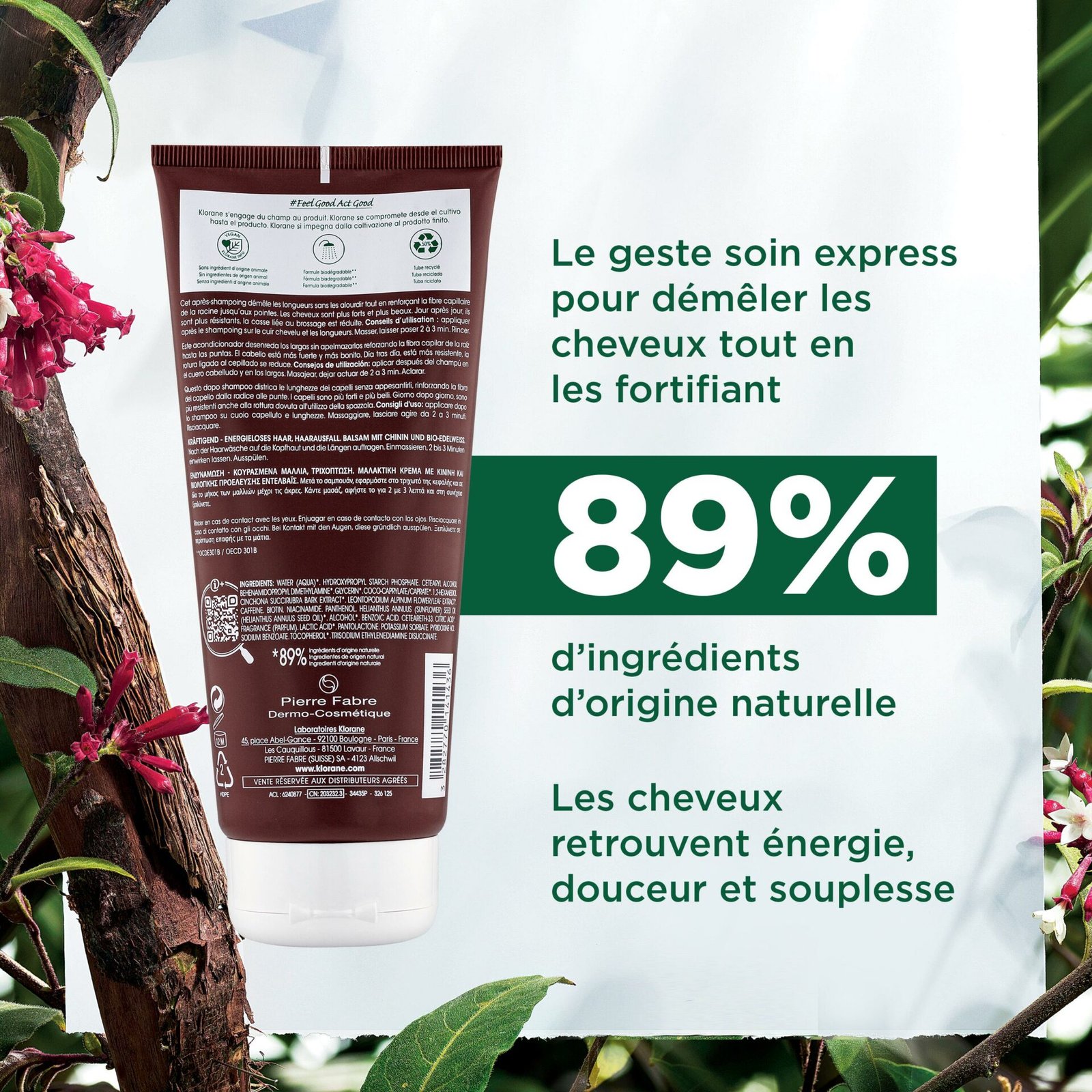 Cet après-shampoing démêle et fortifie le cheveu tout lui en procurant force et résistance. Appliqué sur les longueurs et le cuir chevelu, il offre une action revigorante complète grâce aux vertus naturellement fortifiantes et stimulantes de la Quinine. La structure du cheveu est renforcée, ils retrouvent énergie, douceur et souplesse. L’après-shampoing s’utilise seul ou en complément d’un traitement antichute.