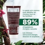 « – Démêle : sa formule onctueuse à laisser poser 2-3 minutes contient un agent coiffant qui permet un démêlage facile de la chevelure une fois rincée. – Energise : stimulant, l’après-shampoing à la Quinine revitalise les cheveux et les aide à retrouver vigueur et brillance. – Renforce : en fortifiant la structure et la fibre des cheveux en manque de vitalité, l’après-shampoing redonne force et résistance à la chevelure. »