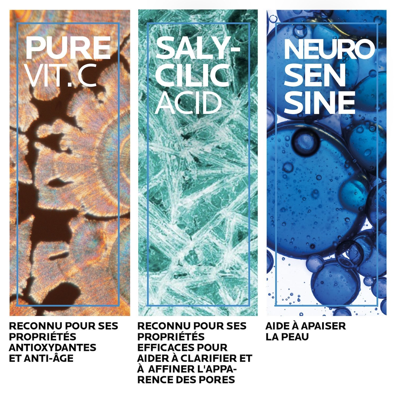 Ingrédients Clés : Vitamine C Pure pour donner de l’éclat et lisser les rides | Acide Salicylique pour lisser et adoucir | Neurosensine pour apaiser.