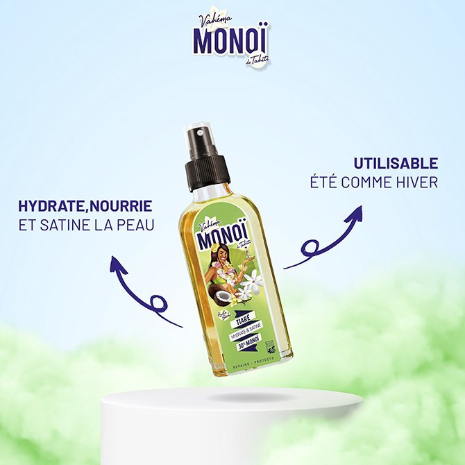 L’Huile sèche Tiaré, riche en Monoï de Tahiti, hydrate, nourrit et satine la peau.